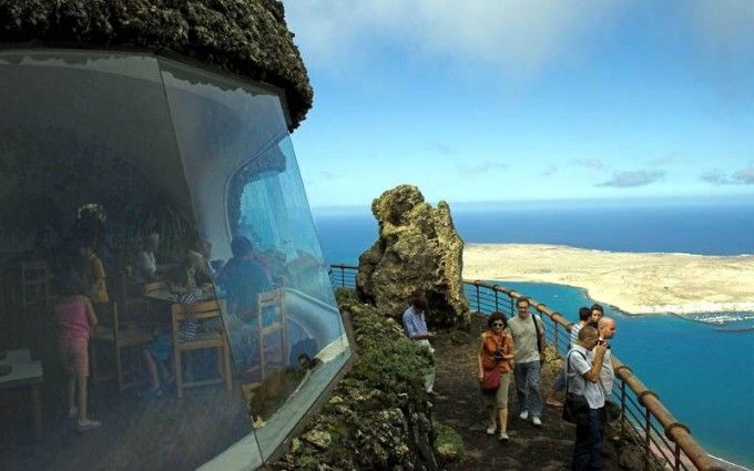 El Mirador del Río, situado en la zona Norte de la isla de Lanzarote, a más de 450 m de altitud, dentro de la localidad de Haría. Al frente se encuentra las islas Chinijo, La Graciosa y el Océano Atlántico. Mimetizado en la roca del acantilado, este emplazamiento guarda alguno de los episodios más intensos de la guerra entre España y EUA por la posesión de Cuba (siglo XIX). El autor de la obra es César Manrique, el artista local que transformó la isla conjugando naturaleza y arte.